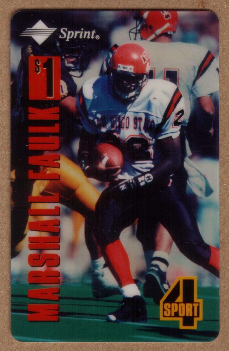 This collectible phone card features an action photograph of football player Marshall Faulk from San Diego State. Faulk is shown gripping a football while running on a green field, wearing a white jersey with "SAN DIEGO ST" visible across the front in red letters, along with black pants and red socks. His helmet is red and white, matching the team colors. The card displays the value "$1" in black text on an orange rectangle at the upper left corner.