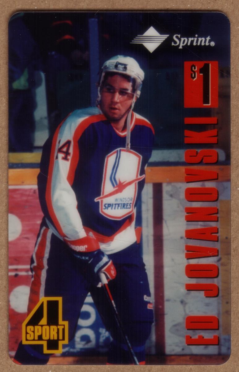 This phone card captures Ed Jovanovski during his time in the National Hockey League system, linked to the 4-Sport series of hockey collectible cards issued by The Score Board Inc. It is designed for collectors of hockey and CHL memorabilia and represents the sports connection with Sprint's phone card line.