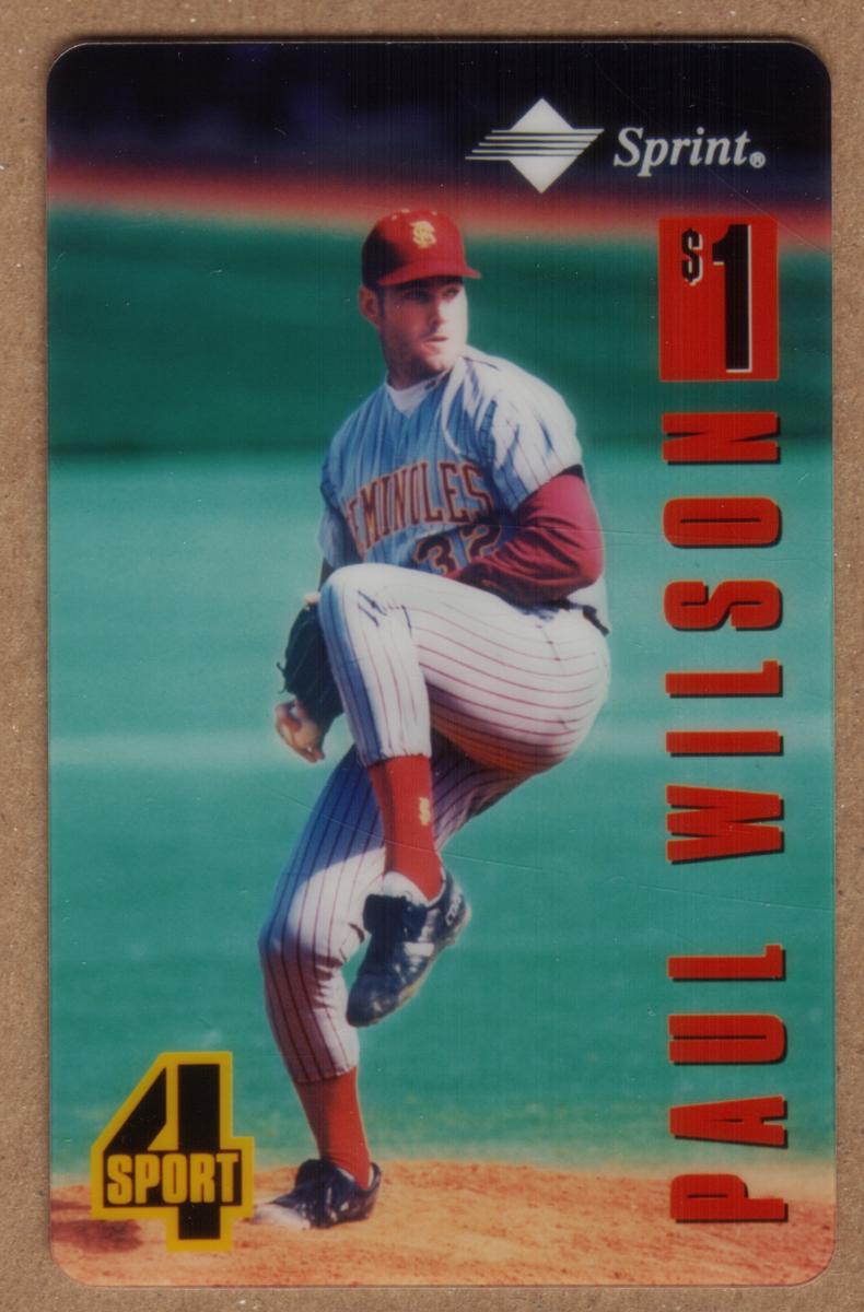 This collectible Sprint phone card features a full-color photographic image of Paul Wilson, a baseball player for the Florida State Seminoles, in mid-pitch on a baseball field. Wilson wears a striped white and maroon Seminoles uniform with a red cap featuring the Seminoles logo. The card shows Wilson poised on the pitcher's mound with his left leg lifted as he prepares to throw the ball.