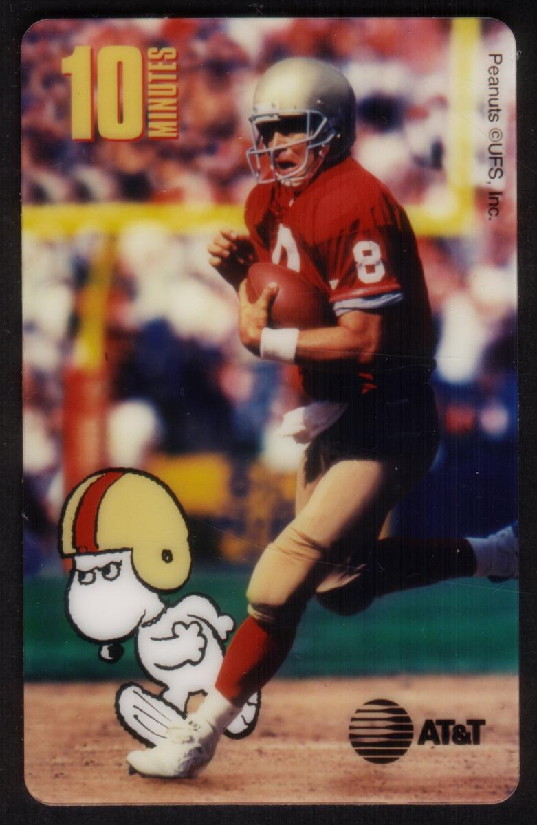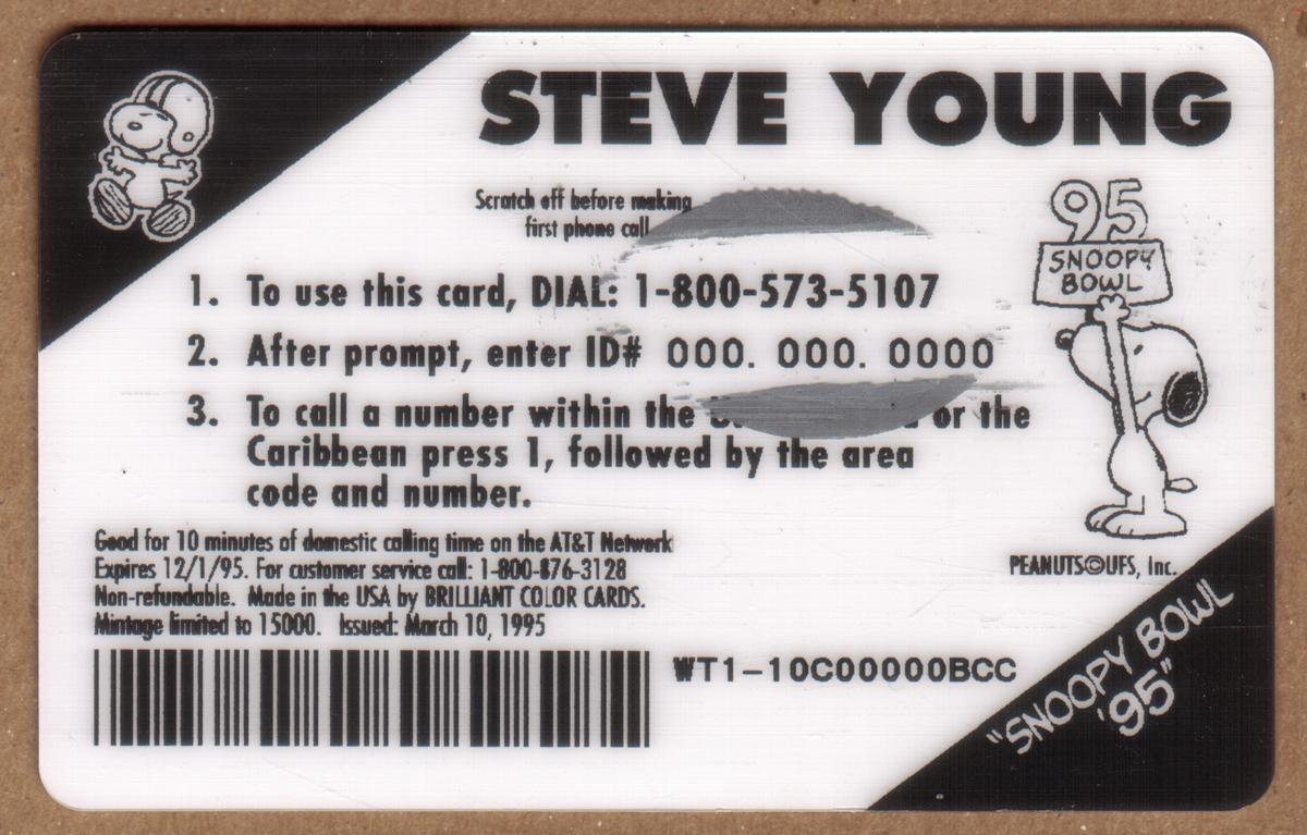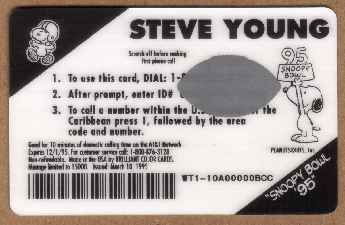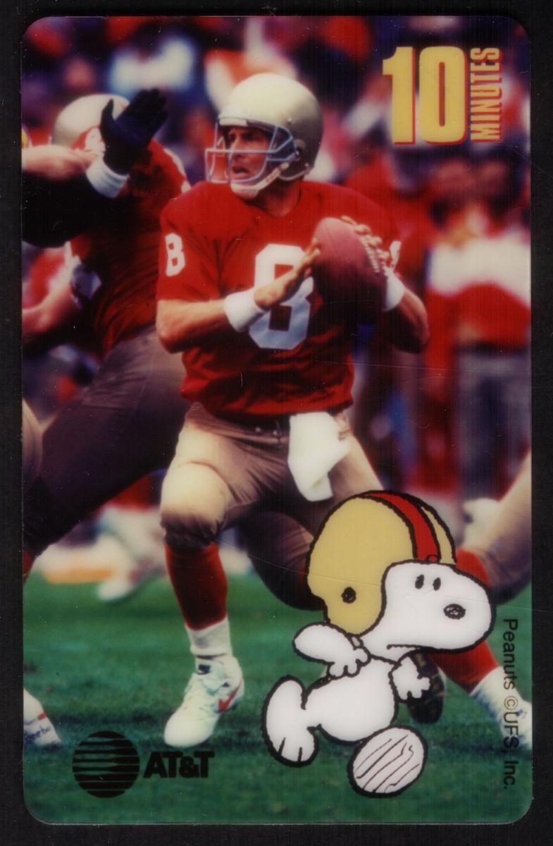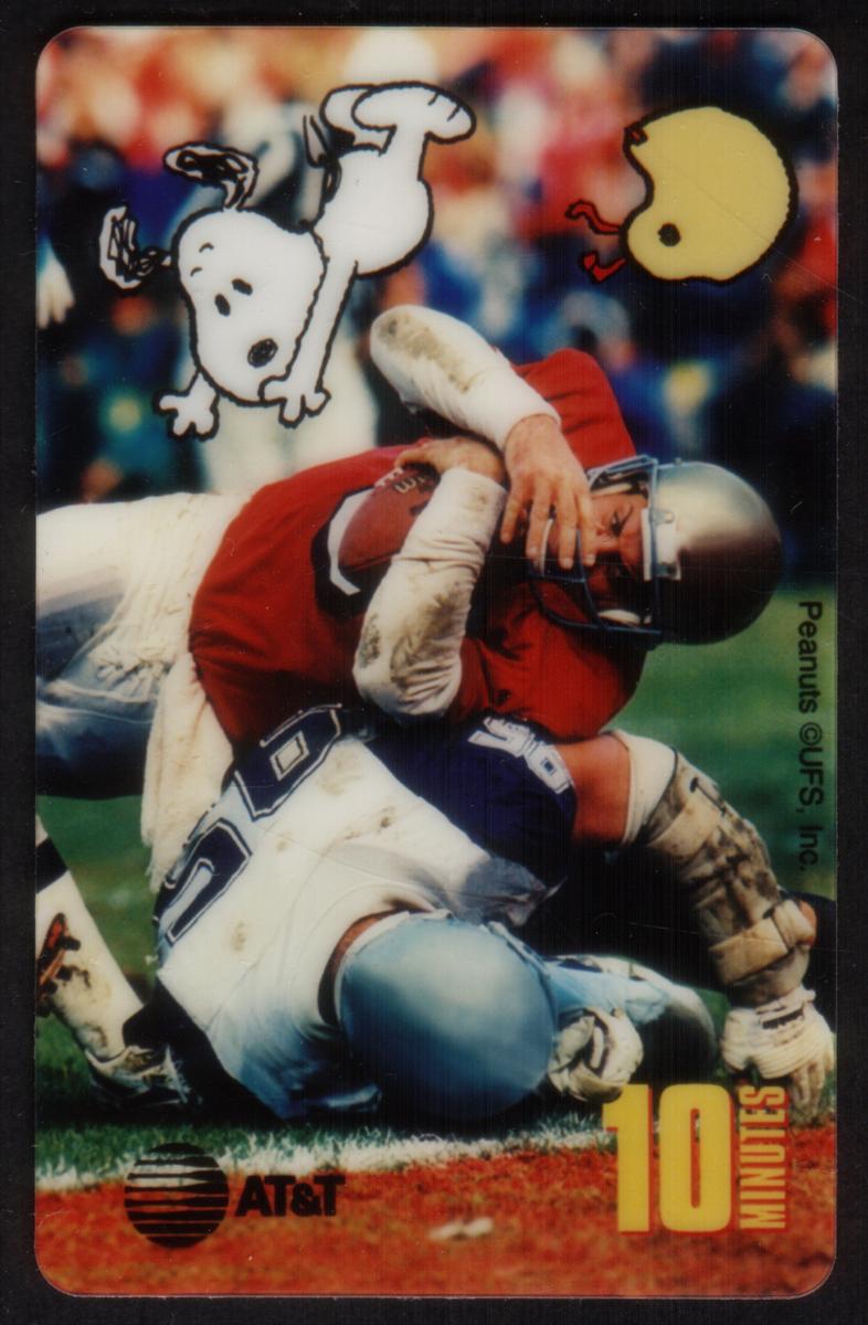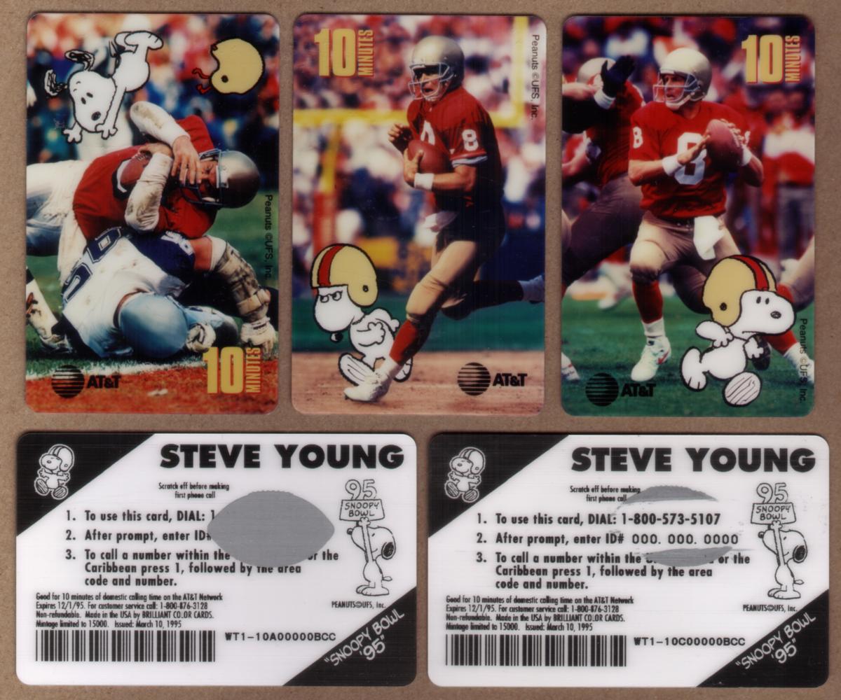 1995 American football and Peanuts themed phone cards featuring Steve Young and Snoopy, with vibrant images, playful design, and 3 or 10-minute airtime options. |