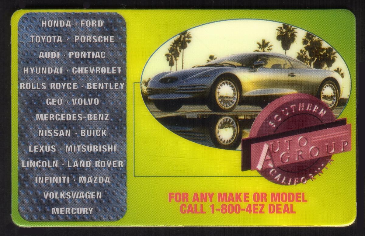 The card’s color scheme balances vivid yellow and blue backgrounds with the silver sports car and the pink logo, making the logos and text stand out clearly. The card identifies the Southern California Auto Group as the service provider connected to various automobile brands, emphasizing accessibility for all vehicle makes and models.
