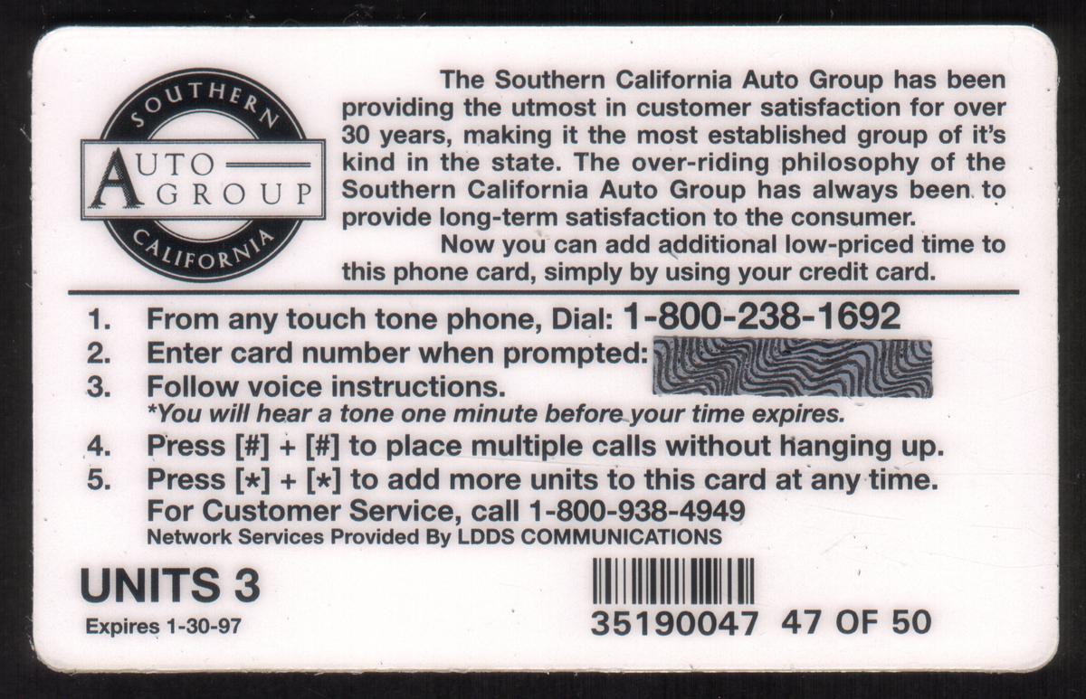 This collectible phone card from LDDS WorldCom features a contemporary silver/grey sports car as its central image. The car is presented in an oval frame showing a side view with clear reflections beneath it, set against a background with palm trees, evoking Southern California. Superimposed on the lower right side of the oval is a pink and purple logo that reads "Southern California Auto Group," with a bold "Auto Group" text across the middle.