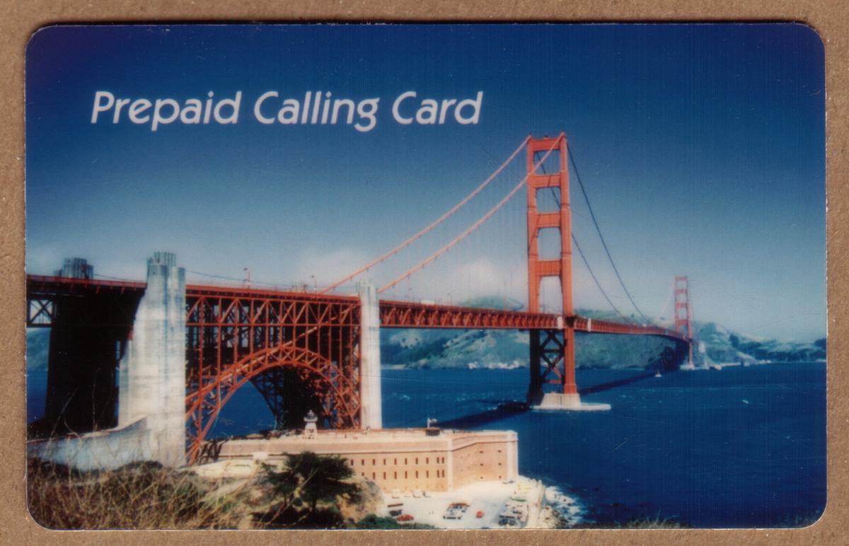 The card’s design includes the text "Prepaid Calling Card" in white at the top left corner, set against a clear blue sky. This collectible item combines iconic elements of California tourism and Americana, highlighting one of the most recognized landmarks in the United States.