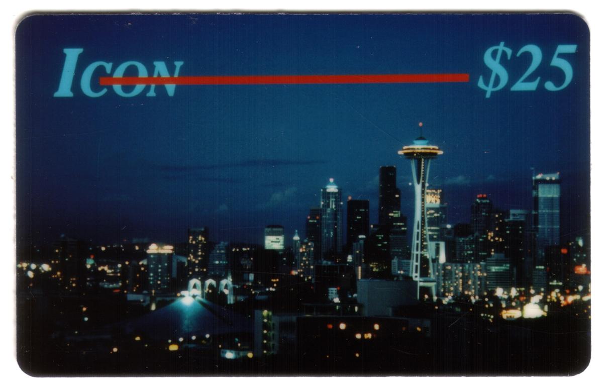 This specimen card is linked to Icon Communications, featuring a $25 denomination. The detailed imagery and clear presentation serve as a collectible tribute to Seattle’s urban landscape, making it a notable piece within the Monument Series dedicated to cities and prominent landmarks.