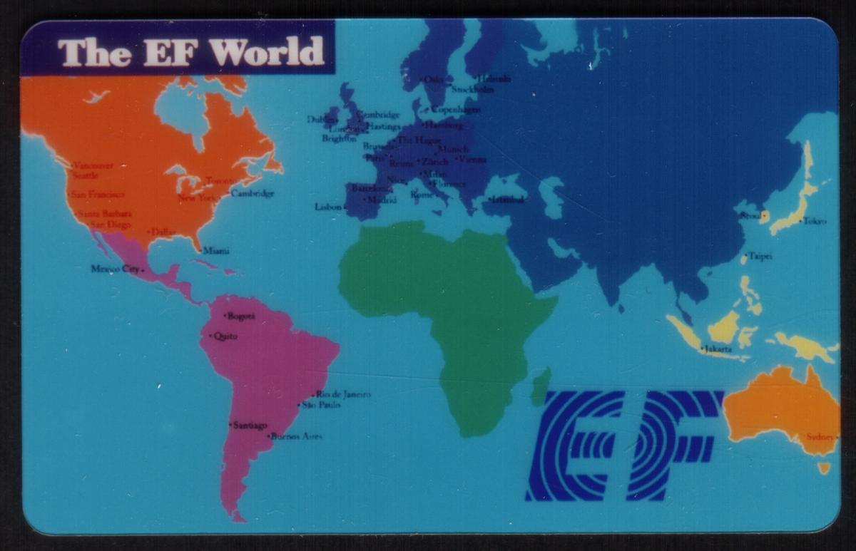 The card bears the inscription "EF Communications" in the design, indicating the issuing or associated entity. The card's design emphasizes global travel and communication, tying together the geographical elements with the concept of worldwide connectivity, embodied by the interconnected cities displayed on the map.