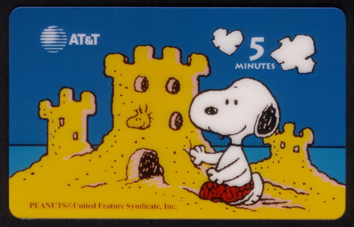 This collectible phone card from AT&T features the character Snoopy from the Peanuts comic strip by Charles Schulz. Snoopy is depicted sitting on the sand at a beach, actively building a large sandcastle shaped like a castle tower. The sandcastle has several rounded protrusions on top and a small arched entrance at the front. The background is a solid blue color, representing the sky.