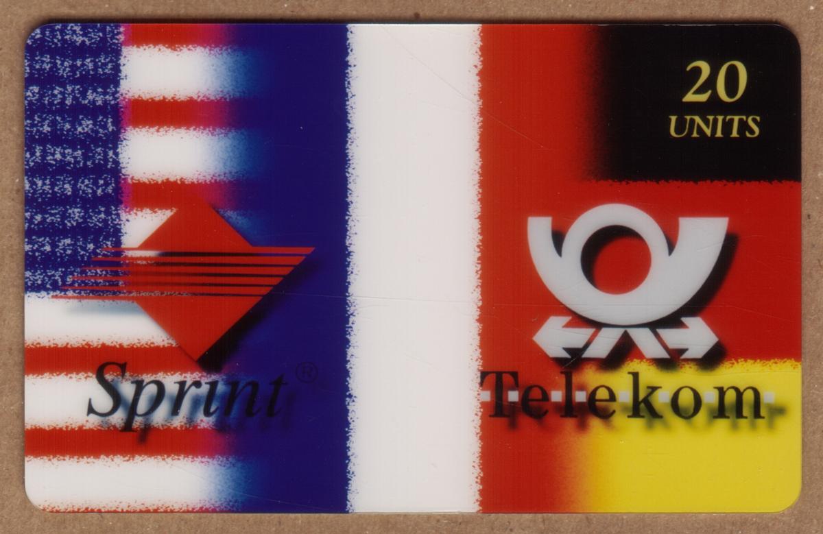 The design is clear and vibrant, focusing on the recognizable logos and national flags of the United States and Germany. This card relates to telecommunications services and reflects the branding of both Sprint and German Telekom, making it a notable collectible item for those interested in promotional phone cards from these companies.