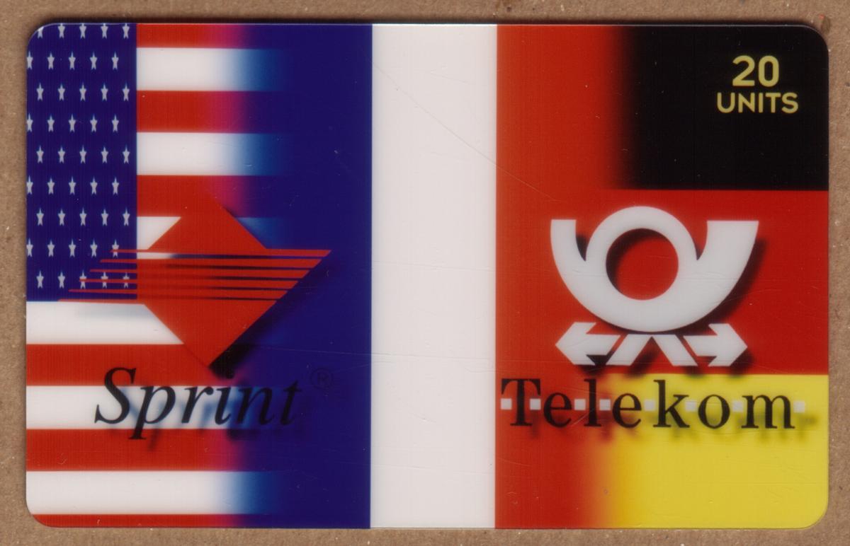 This collectible telephone card features the combined branding of Sprint and Deutsche Telekom, representing telecommunications companies from the United States and Germany. The card’s design is divided vertically into three sections with the left side showing the American flag as a background for the red Sprint logo and black "Sprint" text. The center strip is plain white, acting as a clean separator between the two sides. On the right side, the design incorporates the German flag with the Telekom logo displayed prominently in white, accompanied by black text spelling "Telekom."