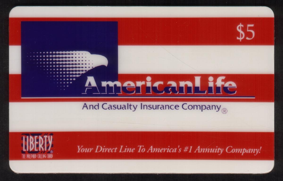 The main text on the card reads "AmericanLife" in large white and red letters with a blue underline. Below this, in smaller text, it states "And Casualty Insurance Company®." In the top right corner, the card's value is printed as "$5" in white on a red background.