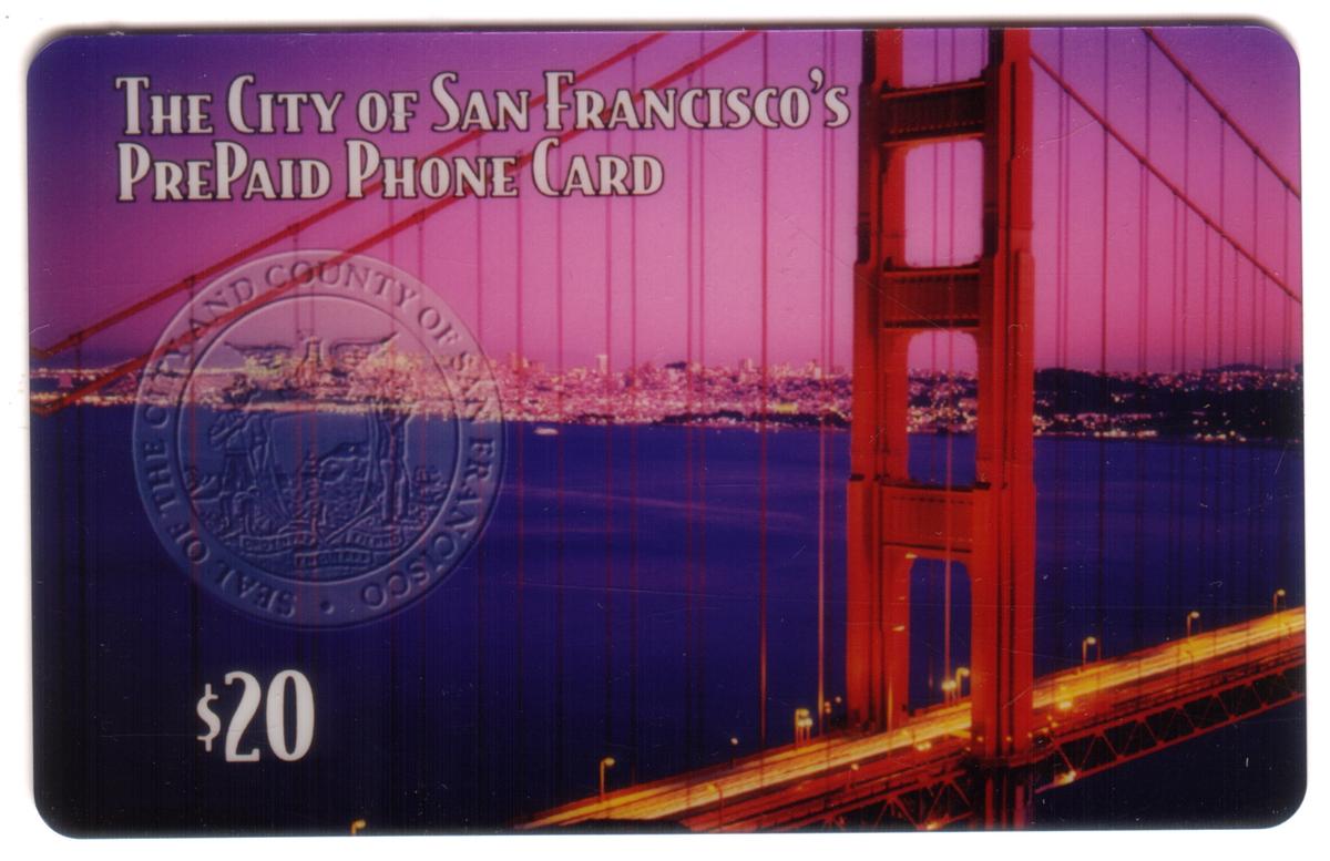 The monetary value of the card, "$20," is displayed in bold white characters in the lower left corner. This card is an Ameritech Optical Scanner Card used to test the scanner and is identified by the keywords related to San Francisco’s Golden Gate Bridge and the city seal. The composition clearly celebrates the city and its iconic landmark while serving as a functional prepaid phone card.