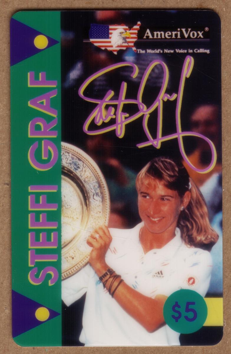 The card has a vertical green stripe on the left side with two small yellow circles and displays the name "STEFFI GRAF" in large pink and yellow capital letters. At the top right, the card features the AmeriVox logo alongside the tagline "The World's New Voice in Calling." A large gold autograph-style graphic of Steffi Graf’s signature dominates the upper center portion of the card. There is a green circular emblem near the bottom right corner indicating the card's value as $5.