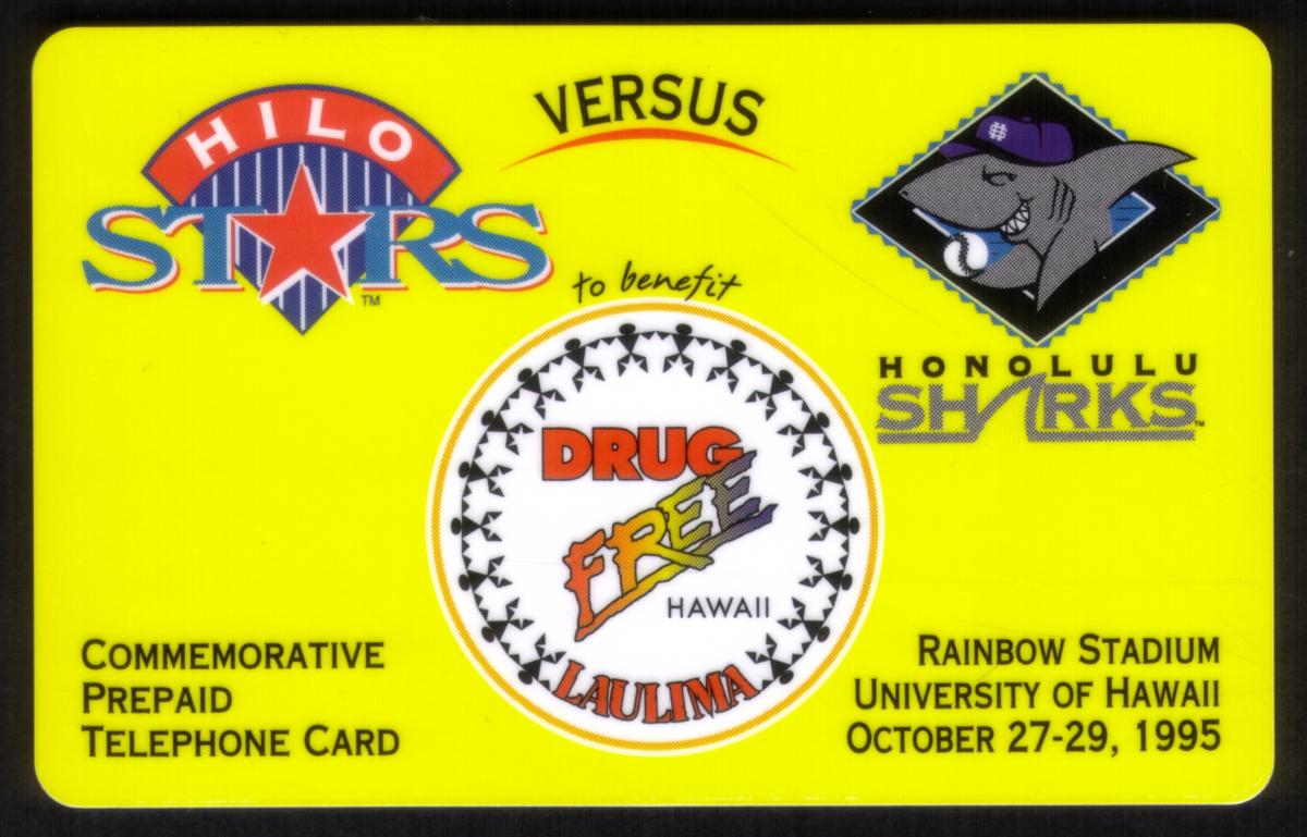 This collectible prepaid telephone card commemorates the baseball series between the Hilo Stars and the Honolulu Sharks held at Rainbow Stadium, University of Hawaii, from October 27 to 29, 1995. The bright yellow card prominently features the logos of both teams: "Hilo Stars" with a red star and blue striped background on the left, and the "Honolulu Sharks" logo on the right, depicting a smiling shark wearing a purple cap marked with a white letter "H."