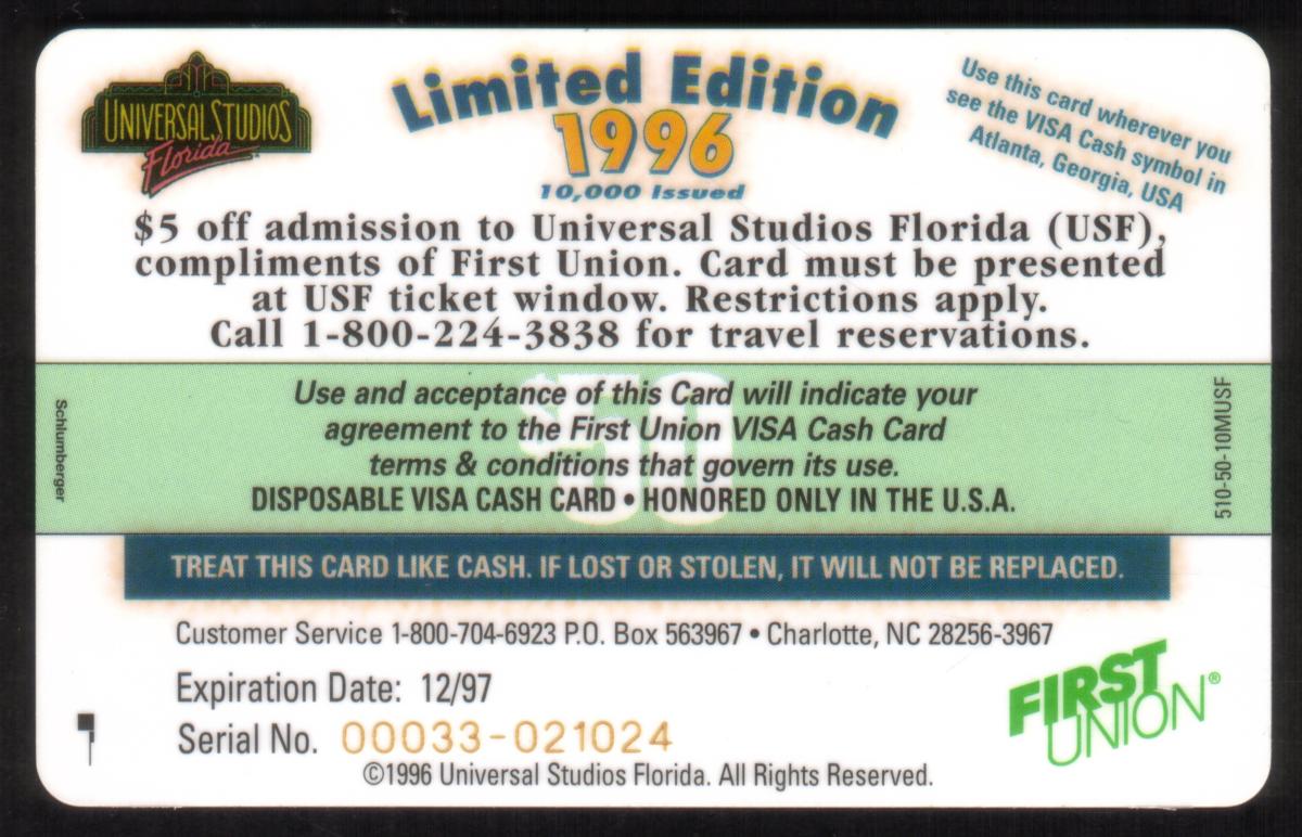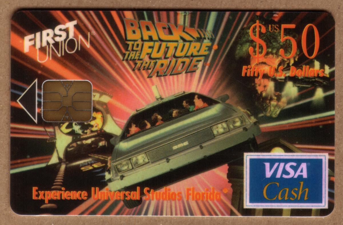 This card combines elements of Hollywood entertainment, Universal Studios theme park promotion, and banking functionality, making it a collectible item from 1996. It celebrates the popular movie franchise "Back to the Future" through imagery tied directly to the ride experience, issued by First Union Corp. Bank as a Visa Cash stored-value card.