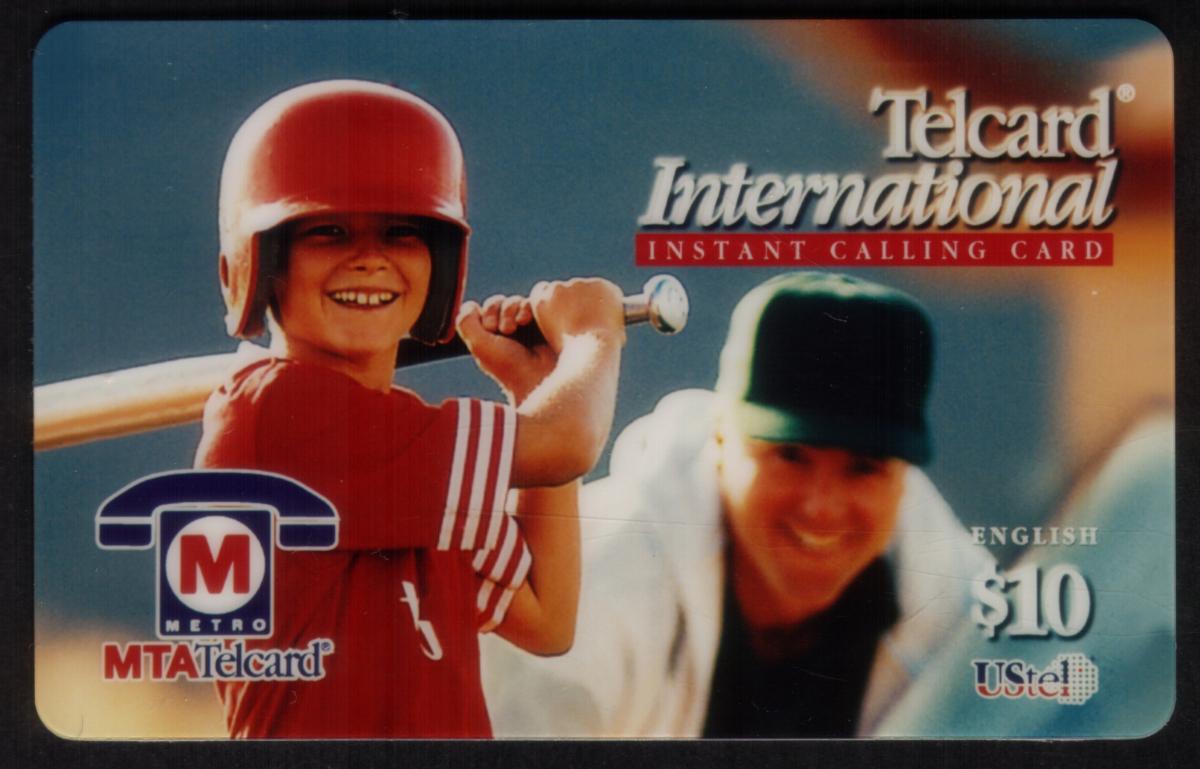 This collectible phone card is related to the sport of baseball, highlighting a left-handed batter as noted by the keywords. The design’s focus on youth and baseball emphasizes a sporting theme combined with the Metro MTA Telcard and USTel branding. The card offers prepaid calling services valued at ten U.S. dollars for international calls.