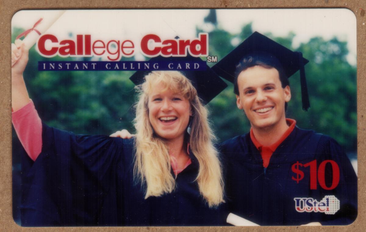 This promotional phone card is labeled with the brand UStel and is designated for use with the U.S. telephone system. It highlights a celebration of college graduation with the imagery of two graduates and their diplomas, emphasizing the theme of achievement and education. The design is bright, cheerful, and professional, targeting college students or graduates as its primary audience.