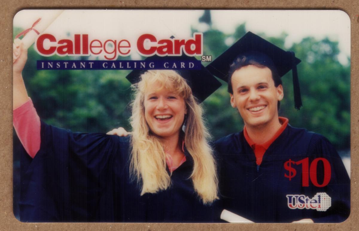 This collectible Callege Card is an instant calling card with a $10 value issued by USTel. The card features a photographic image of two college graduates wearing black caps and gowns. The graduate on the left is a woman with long blonde hair smiling broadly and raising her right hand, while the graduate on the right is a man with short brown hair holding a diploma and smiling at the camera. The background contains greenery that is softly out of focus.