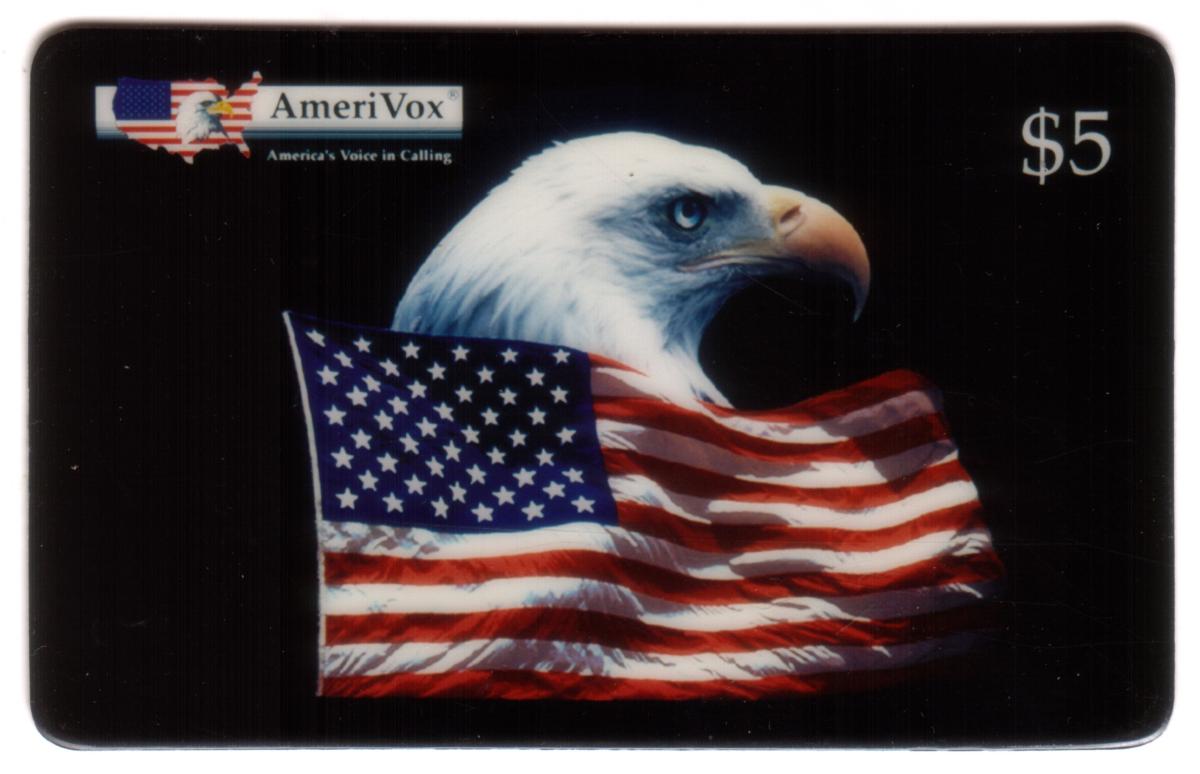The top left corner contains the Americana-themed AmeriVox logo, which includes a small American flag graphic and the slogan "America's Voice in Calling." The card’s value of $5 is clearly marked in white text in the upper right corner. The imagery emphasizes patriotic symbols such as the American flag and the bald eagle, evoking themes of nationalism and pride in the United States.