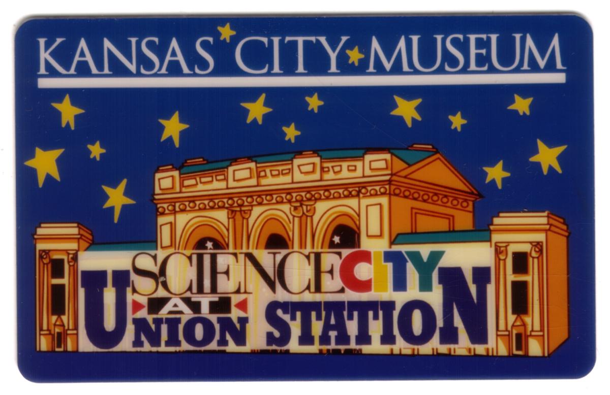 The card prominently displays the text "KANSAS CITY MUSEUM" at the top in white uppercase letters with small gold stars separating the words. Below the station illustration, the words "SCIENCE CITY AT UNION STATION" are showcased in a bold, colorful design. "SCIENCE" is in black, "CI" is in red and cyan, "TY" is in cyan and yellow, and "AT UNION STATION" is in dark blue block letters underneath.
