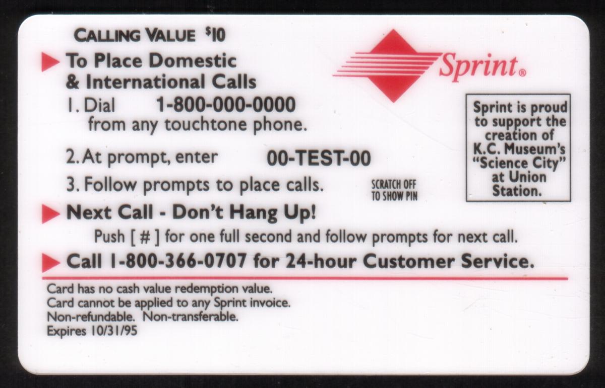 The card is dated 10/31/95 and is valued at $10. It is marked as a prototype test issued by Sprint, associated with WorldCom. This edition commemorates the Kansas City Museum’s Science City interactive science center located at Union Station.