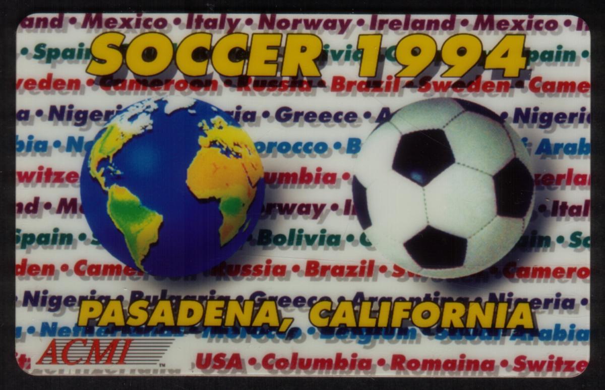 This collectible card commemorates the 1994 Soccer World Cup held in Pasadena, California. The front face prominently features two main visual elements: a detailed globe showing the continents of North and South America with parts of Europe and Africa visible, and a classic black and white soccer ball, symbolizing the sport. Above these elements, the heading "SOCCER 1994" appears in large, bold yellow text.