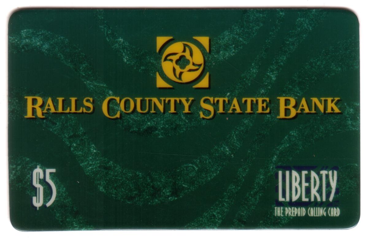 This collectible bank card reflects the corporate style of the financial institution, combining official logos with monetary and communication service values. It clearly associates the Ralls County State Bank with the Liberty prepaid calling service, making it both a promotional and functional bank card for use tied to the banking institution.