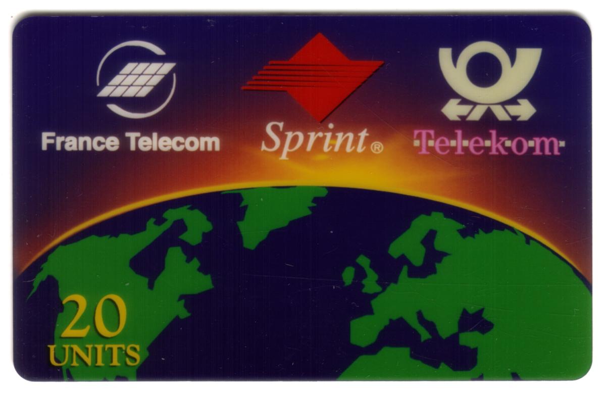 International telecom phone card featuring logos of France Telecom, Sprint, and Telekom, with Earth imagery and global connectivity themes. |