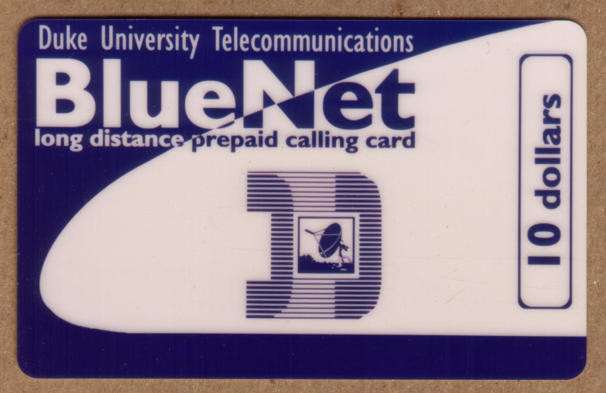 On the right side of the card, inside a vertical rectangular box outlined in blue, the value "$10 dollars" is clearly indicated. The design is straightforward and functional, emphasizing Duke University Telecommunications and its BlueNet long-distance calling service. This phone card is a collectible specimen related to Duke University’s telecommunications offering.