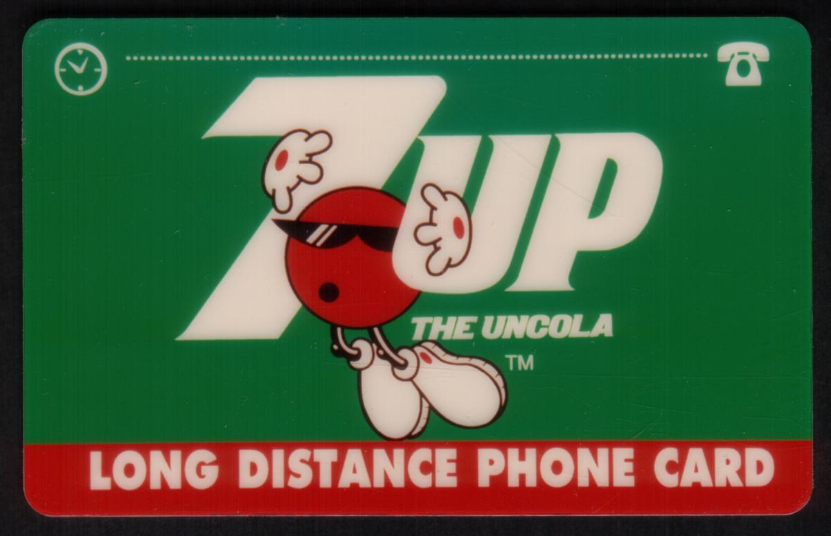 This collectible phone card features the iconic 7-Up logo prominently in white bold letters against a green background. Central to the design is the 7-Up "red dot" mascot, depicted as a red circle with white cartoon gloves and shoes, wearing black sunglasses and striking a lively pose with its arms raised and legs bent. Beneath the large "7 Up" text, the slogan "THE UNCOLA" appears in smaller white letters.