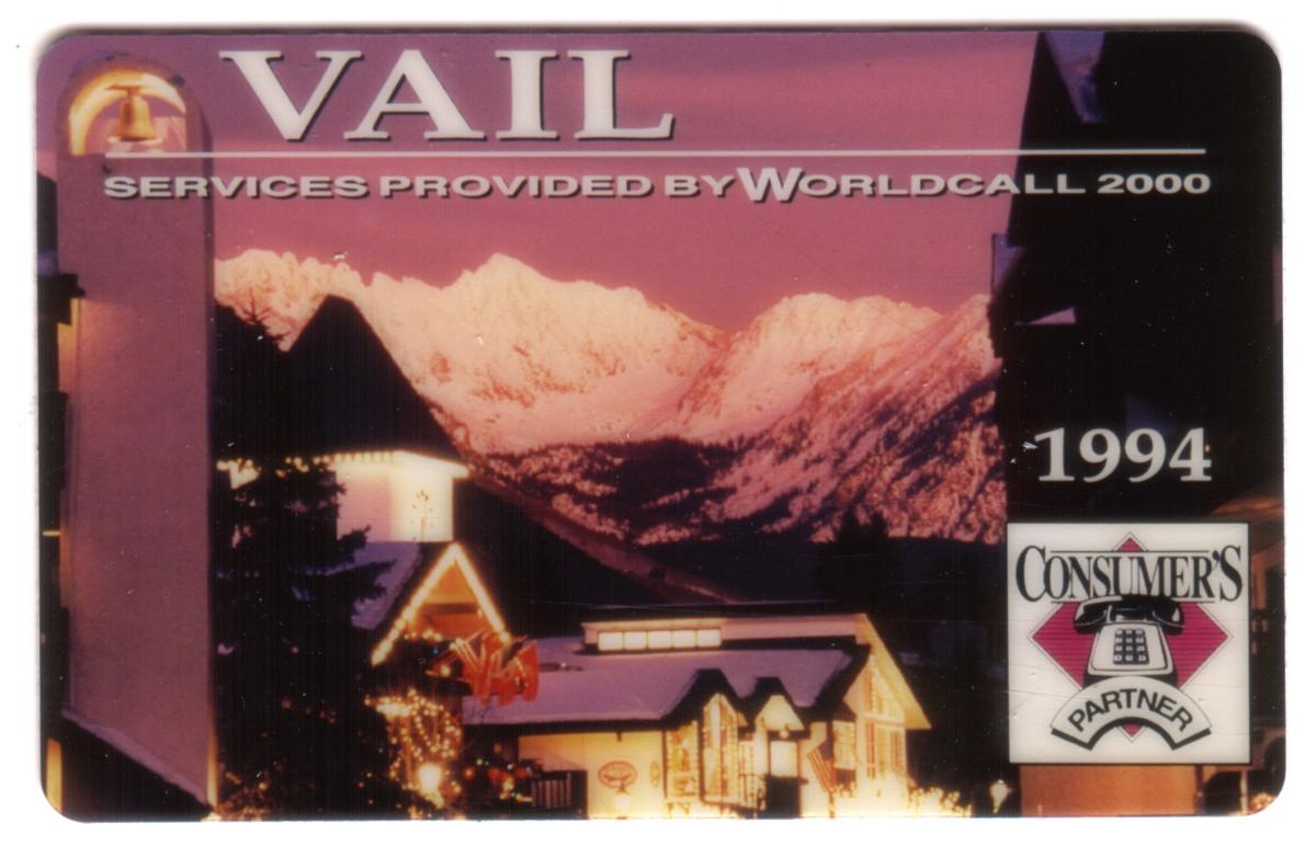 Vail Colorado ski resort scene from 1994 featuring snow mountains, cozy village lights, and a WorldCall phone service logo, blending winter beauty with utility. |