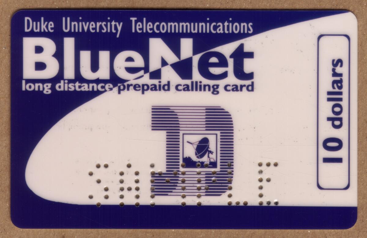 This collectible phone card is a Duke University Telecommunications BlueNet long distance prepaid calling card with a value of 10 dollars. The card features a blue and white color scheme. At the top left is the text "Duke University Telecommunications" in small, white uppercase letters set against a solid blue background. Below this, "BlueNet" is prominently displayed in large, bold white letters. Directly under "BlueNet," the card reads "long distance prepaid calling card" in smaller white text.