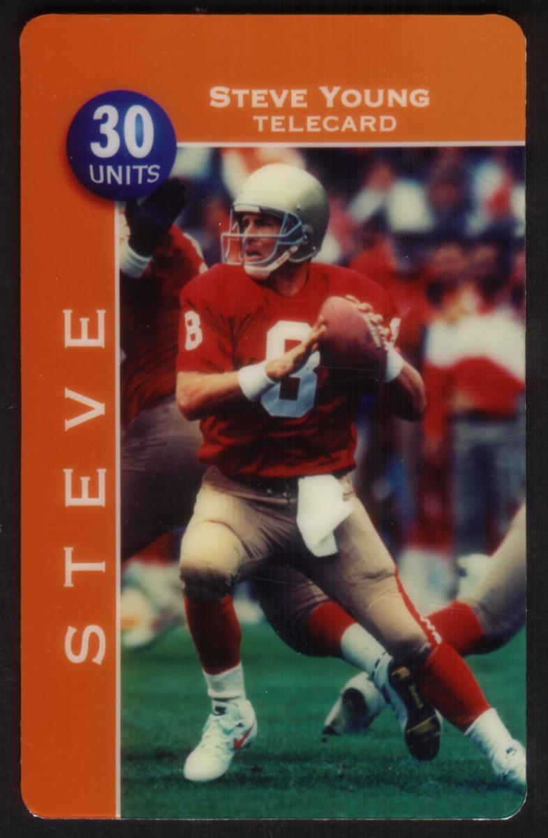 The image captures a moment on the football field with a blurred crowd visible in the background, emphasizing the focus on Steve Young. This collectible telecard is related to football and specifically highlights Steve Young as the main subject.