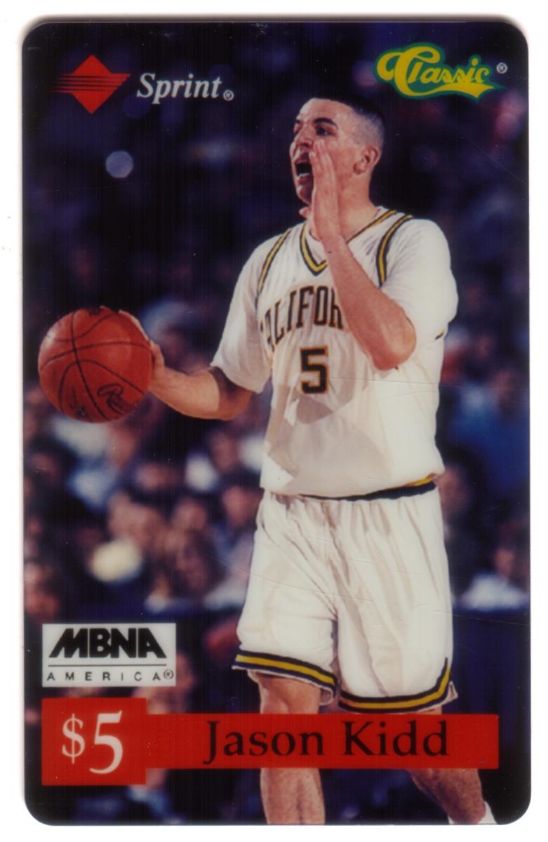 This card is connected to the themes of basketball, the NBA, and sports collectibles. It prominently features the player Jason Kidd, recognized for his basketball career, and ties in financial institution branding from MBNA America alongside telecommunications branding from Sprint.