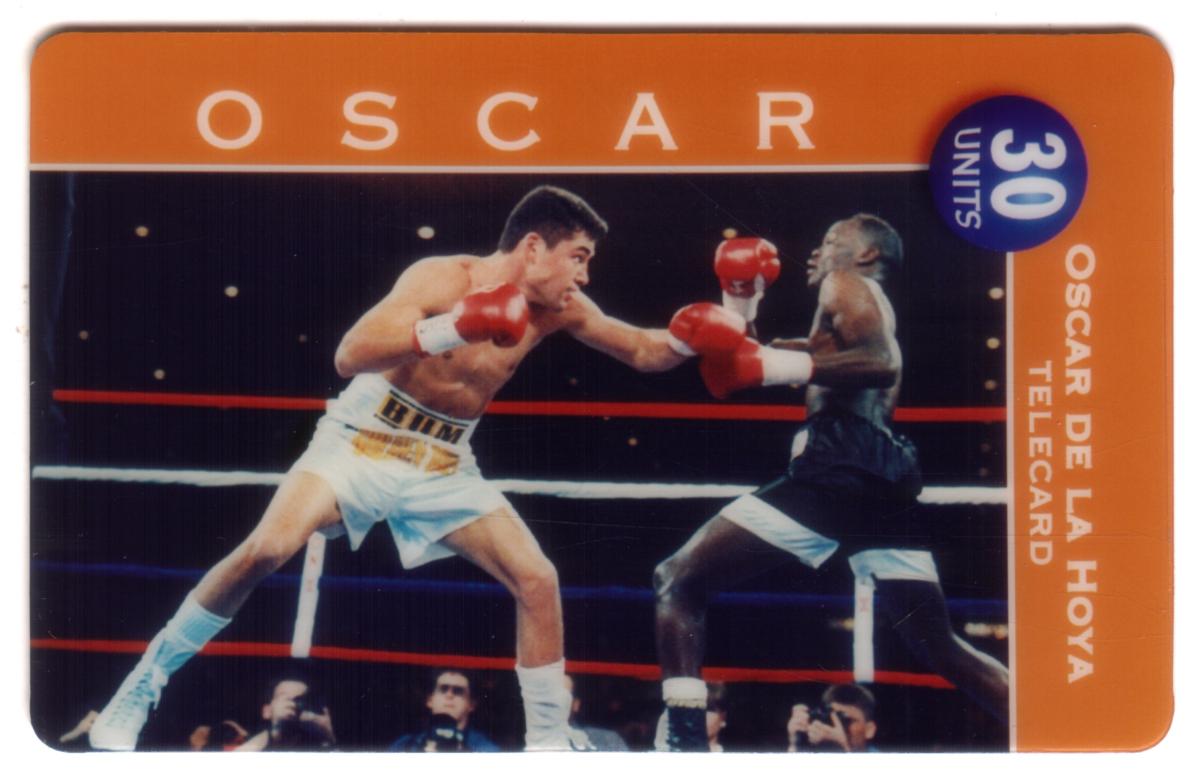 This collectible Telecard features a dynamic boxing scene with Oscar De La Hoya engaged in the ring against an opponent dressed in black trunks and gloves. Oscar De La Hoya is wearing white trunks with gold accents and red boxing gloves, captured mid-action as he throws a punch. The boxing ring is visible with red and white ropes, and an audience can be seen seated in the background.