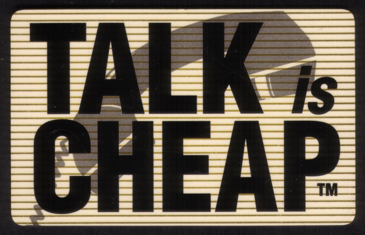 This collectible phone card features a bold design with the prominent phrase "TALK is CHEAP™" displayed in large black capital letters. The background consists of horizontal beige and brown stripes, creating a subtle textured effect. Behind part of the text, a shadowed image of a classic telephone handset is integrated into the design, symbolizing telecommunication themes.