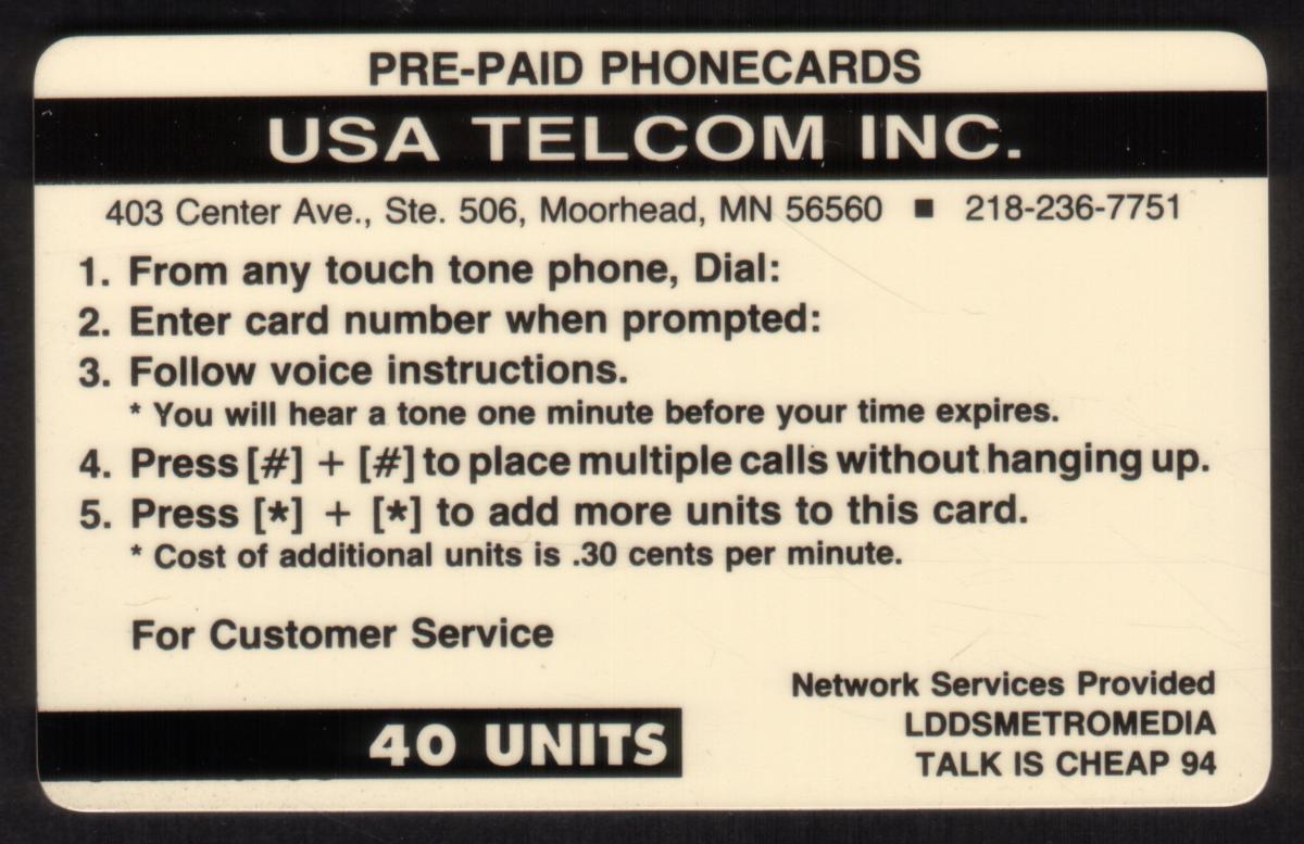 The card is related to LDDS Metromedia and USA Telecom, Inc., as indicated by the included keywords. The card is a user card with a 40-unit value. It dates from 1994 and is associated with Minnesota. The overall design emphasizes affordability and communication, reflecting its purpose as a discount phone card under the “Talk is Cheap” branding.