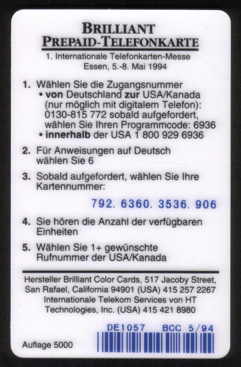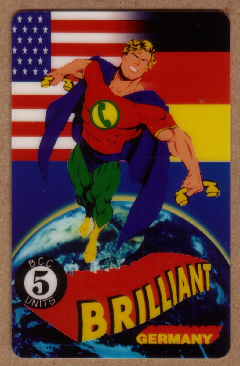 The word "BRILLIANT" appears in large, yellow letters with a red outline along the lower right side of the card, with "GERMANY" printed below it in solid red block letters. This card is identified as part of the Telecard Events collection, linked to the Telecard Show in Essen, Germany, dated 05/94. It is associated with artistic and fantasy themes focusing on superheroes and telephones, and is categorized under "Brilliant Color Cards."
