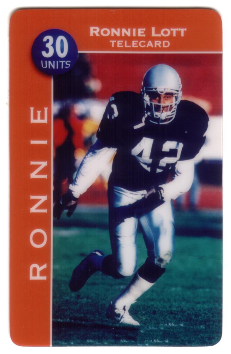 This collectible phone card features Ronnie Lott, a well-known professional football player, depicted in full action wearing his black and silver uniform with the number 42 on the jersey. The image captures Lott mid-stride on the football field, emphasizing his dynamic presence during a game. The background shows a blurred crowd, putting the focus squarely on Lott’s athletic form.
