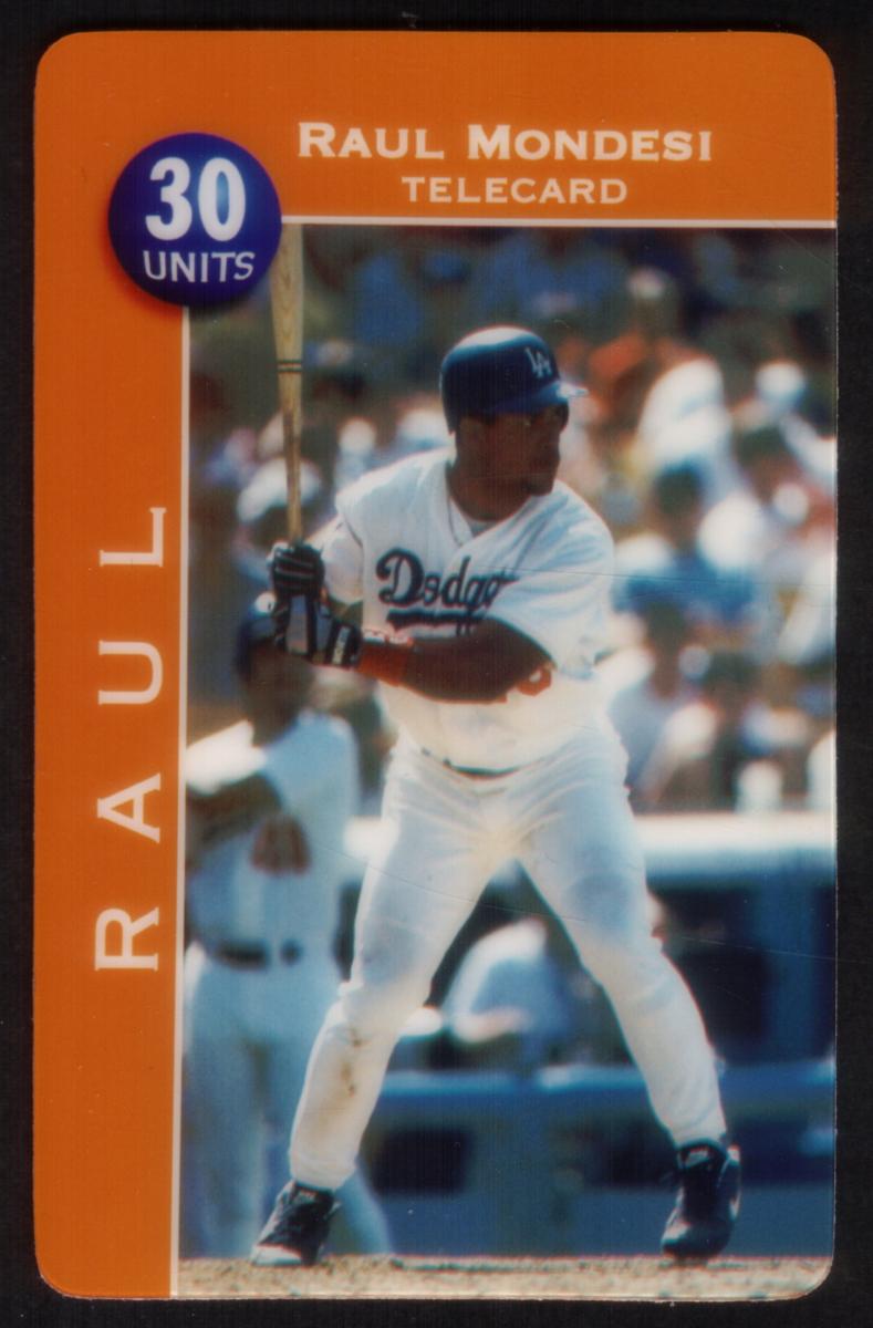 This telecard is associated with the Unocal 76 Service Station brand, as indicated by the keywords, and it features the Los Angeles Dodgers logo linking it directly to Major League Baseball’s Dodgers team. The card is part of a set related to baseball sports collectibles, with mention of Raul Mondesi as a key figure on the card.