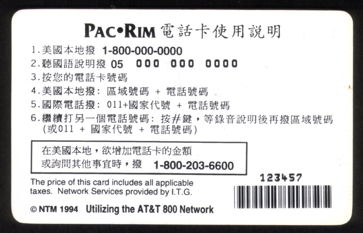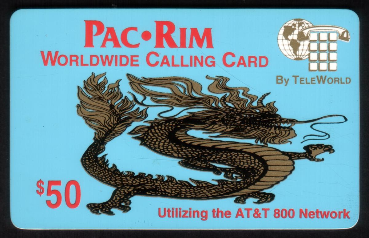 This card is associated with international calling, specifically emphasizing the Pacific Rim region, and references AT&T's network infrastructure. The design includes Chinese symbols and dragons, signifying cultural elements related to China and the broader Pacific Rim area. This card is a specimen prototype from Teleworld International and holds collectible value among phone card enthusiasts.