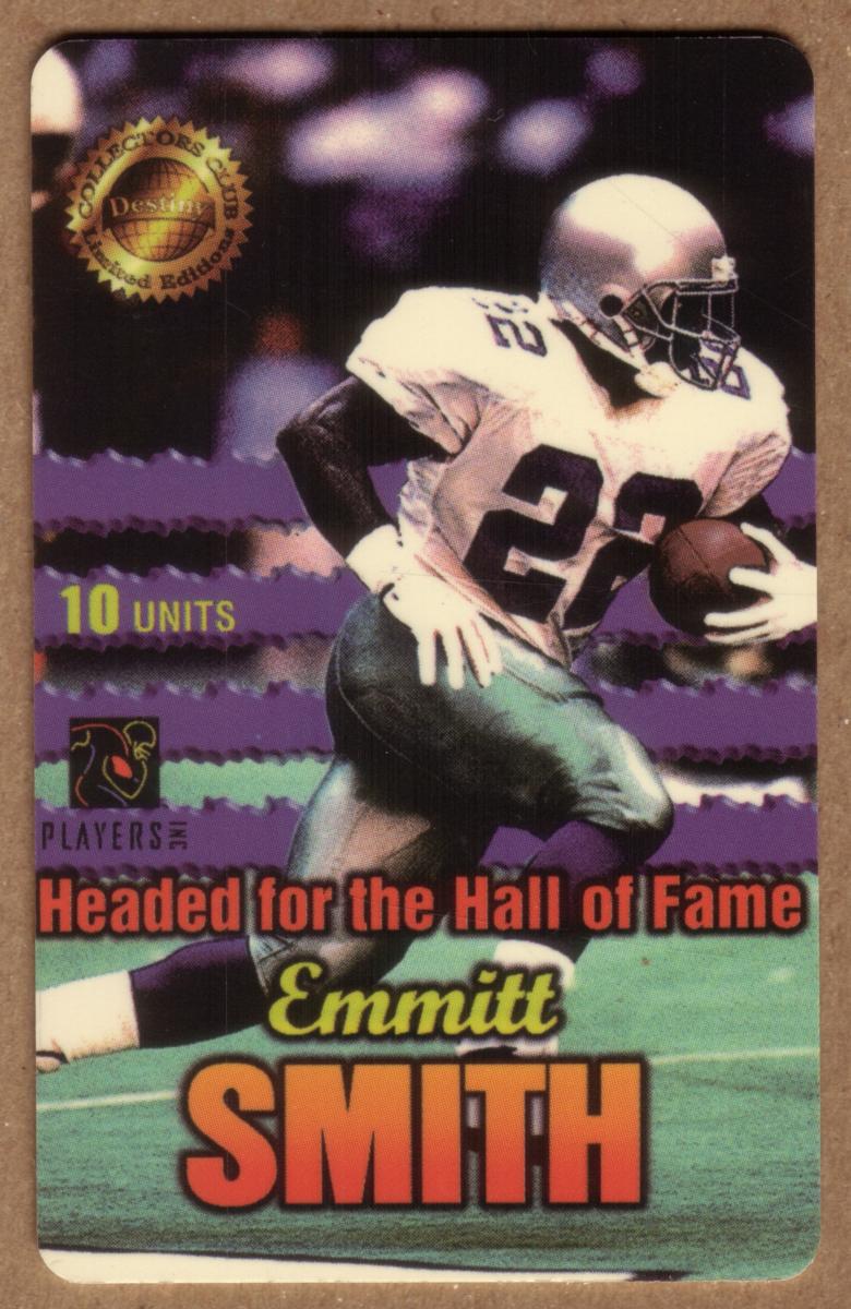 This collectible phone card features Emmitt Smith, the Dallas Cowboys running back, in full football gear running on a football field. He is wearing a white football jersey with the number 22, dark green football pants, and a silver helmet. The card's background shows a blurred view of the stadium with purple tones adding depth behind the figure.