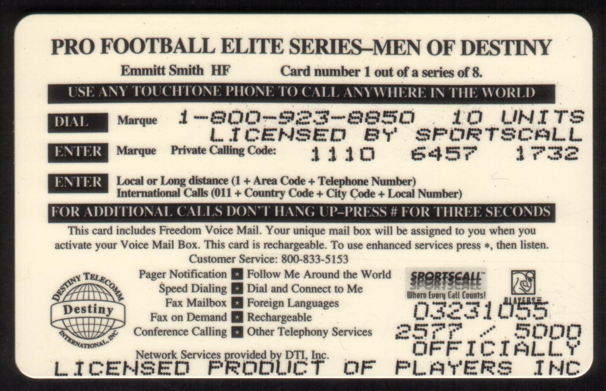 Additional branding includes the Players Inc logo at the lower left corner. The card is part of the "Men of Destiny Hall of Fame Insert" series and classified under the Pro Football Elite series. This is an NFL collectible phone card officially licensed by Players Inc.