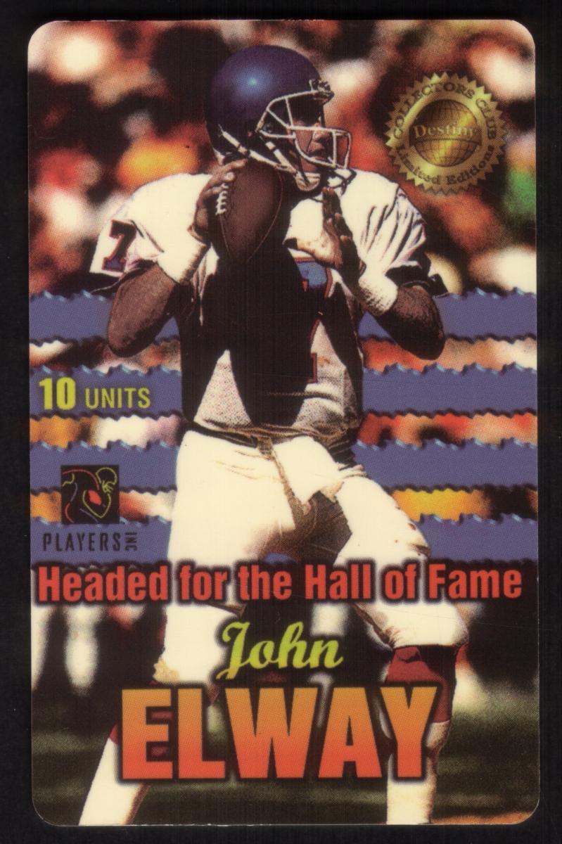 This card is part of the Pro Football Elite Series, officially licensed by Players Inc., and celebrates John Elway, the Denver Broncos quarterback and Hall of Fame inductee. The design highlights the National Football League and honors Elway's distinguished professional football career.
