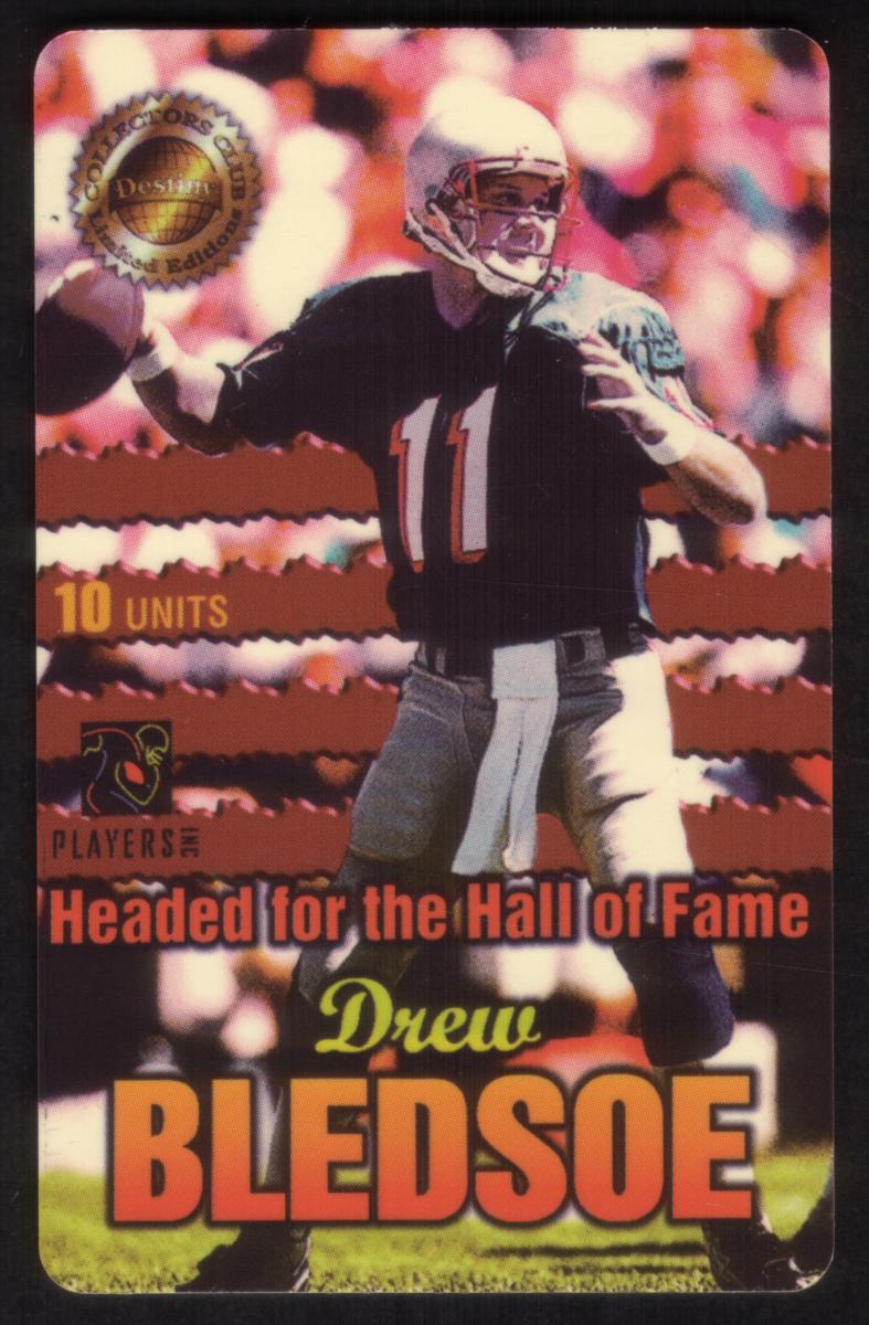 This collectible phone card is from the Pro Football Elite series and features Drew Bledsoe, a quarterback known for his time with the New England football team in the National Football League (NFL). The front of the card shows a photographic image of Drew Bledsoe in action during a game, wearing a black jersey with the number 11. He is captured in a passing stance, preparing to throw a football. The background is blurred with warm tones of orange and red, likely representing stadium seating or fans.