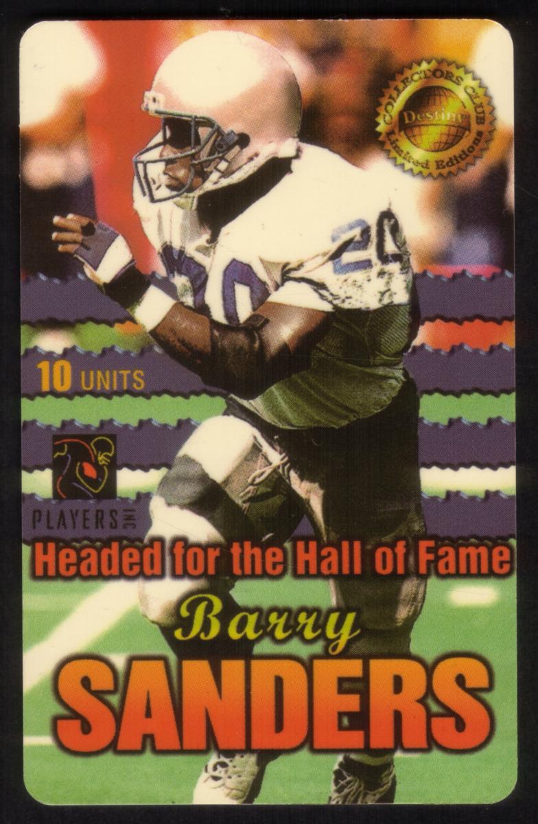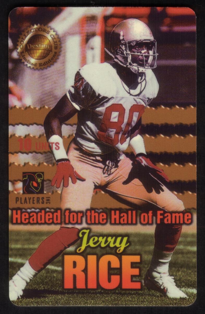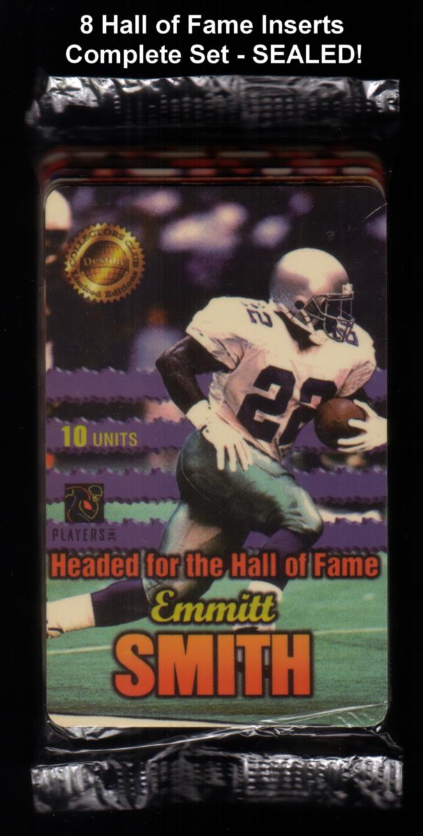 These collectible phone cards are part of the "Headed for the Hall of Fame" insert set from the Destiny Pro Football Elite series, officially licensed by Players Inc and WorldCom. Each card features a prominent NFL football player in action during a game, emphasizing their athletic skill and posed with the football. The set is complete with 8 different cards, each displaying 10 units.