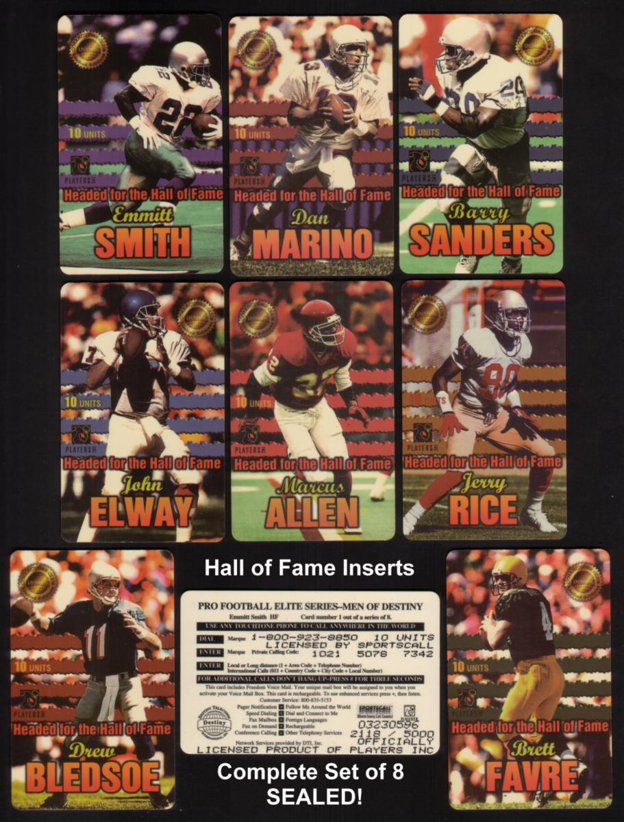 Keywords: sports: football, football players, NFL, National Football league, insert, pro football elite series, headed for the hall of fame, officially licensed product of players inc, rice, bledsoe, marino, allen, favre, sanders, elway, smith, Destiny Telecomm