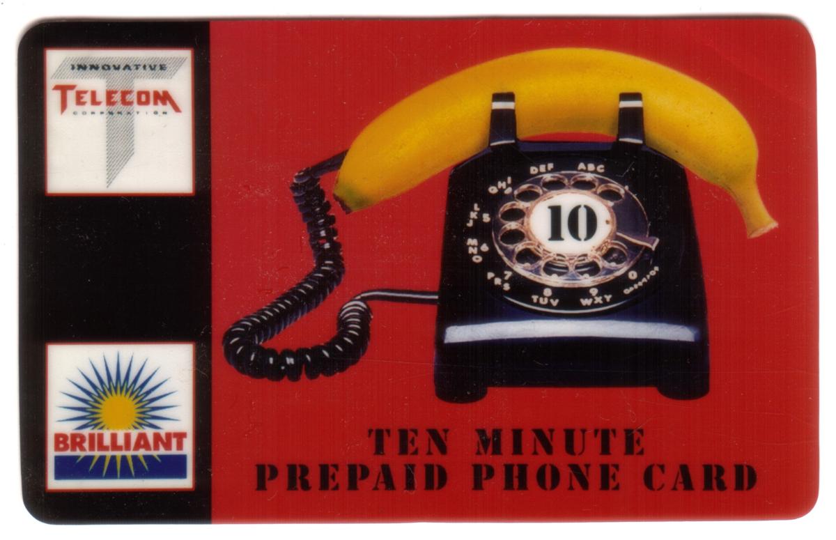 At the bottom right of the card front, the text "TEN MINUTE PREPAID PHONE CARD" is printed in black capital letters. This card is known as the "10m Banana Phone Promo" issued by Brilliant & Innovative Telecom. It clearly combines the imagery of fruit with telephones, specifically highlighting a banana telephone theme on a collectible phone card.