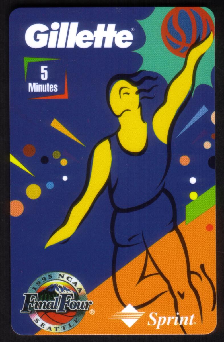 The card includes trademarks and logos connected to the NCAA, as well as the Gillette brand, which sponsored or collaborated on this promotional basketball-themed card. The design incorporates basketball imagery blended with artistic abstract elements, enhancing the overall aesthetic while maintaining a strong connection to the sport. It also features the word "Sprint" indicating a partnership or sponsorship.