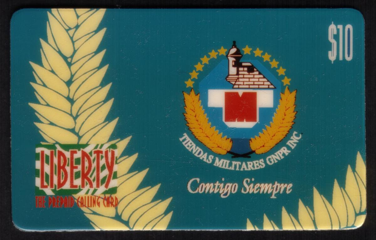 On the left side near the bottom, the words "LIBERTY" appear in large red capital letters, accompanied below by “THE PUERTO RICO CALLING CARD” in smaller red text. This card was issued by Quest Group International as part of a collectible phone card series honoring military forces connected to Puerto Rico.
