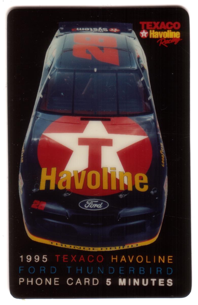 This collectible phone card features a top-down view of the 1995 Texaco Havoline Ford Thunderbird race car. The car showcases the large, iconic Texaco star logo in white and red across the hood, with the word "Havoline" in bold yellow lettering overlaying the star. The number 28 is visible on the front left corner of the car's bumper. A blue Ford logo is centered on the front grille area.