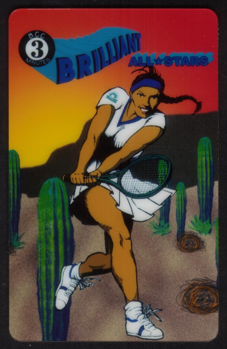 This card is associated with the September 1994 Phone Plus Super Show in Phoenix, Arizona, highlighting the All Stars Women's Tennis Championship. The artistic design showcases a blend of sports and Southwest desert elements, including cactus plants and a warm color palette reflecting the Arizona setting. It belongs to the Brilliant Color Cards collection and serves as a specimen from this series.